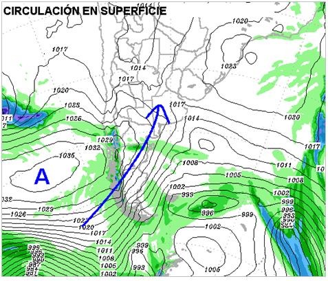 En el mapa se presenta la circulación en superficie para la noche der ayer. En ella se destaca un potente sistema de alta presión sobre el Pacifico sur. Dadas las características naturales de circulación, el mismo tracciona aire frío desde latitudes subpolares (la flecha azul es esquemática). Esta fuente de aire es la que provee los enfriamientos más marcados del invierno. Sin llegar a ser una irrupción de aire polar, la misma es intensa y logrará la persistencia suficiente como para establecer jornadas que se moverán dentro de un rango térmico bien cercano a los típicos de inviernos, con algunas jornadas que mostrarán desvíos negativos.