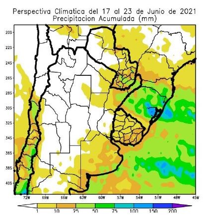 La mayor parte del área agrícola argentina, gran parte del área agrícola paraguaya y la mayor parte del área agrícola uruguaya observarán precipitaciones escasas (menos de 10 mm) con algunos focos con valores moderados.