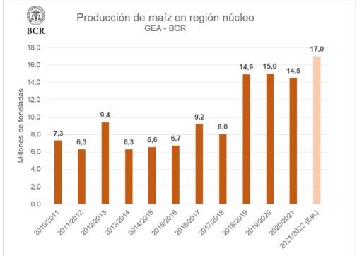 Hace 15 días atrás se estimaba un aumento del 8% del área respecto a la del año pasado. Pero la alta demanda de insumos para el cereal continúa y ya se estima un hectareaje mayor: pasaría de 1,61 M ha —que fueron relevadas por estudio satelital— a 1,79 M ha. Se trataría de la mayor siembra maicera de la región. Este incremento interanual de un 10%, restándole 70 mil ha (porque su producción no ingresaría al circuito comercial) y tomando un rinde promedio de 99,1 qq/ha, muestra un horizonte productivo de 17 Mt. O sea: la región núcleo, con un escenario climático que no fuese ni malo ni muy bueno, produciría casi la tercera parte del maíz argentino (un 31,5%). No hace mucho, entre el 2010 y el 2015 la región núcleo producía, en promedio, tan solo 7 Mt por año. El ciclo 2021/22 plantea un salto de 10 Mt más que en aquella época.