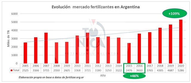 En el gráfico siguiente, observemos la evolución, del mercado de fertilizantes en Argentina, en base a datos de Fertilizar, asociación Civil sin fines de lucro, cuyo objetivo es concientizar sobre la importancia del uso racional de fertilizantes y la sustentabilidad del sistema productivo, la conservación del suelo y el cuidado del ambiente de alta productividad.