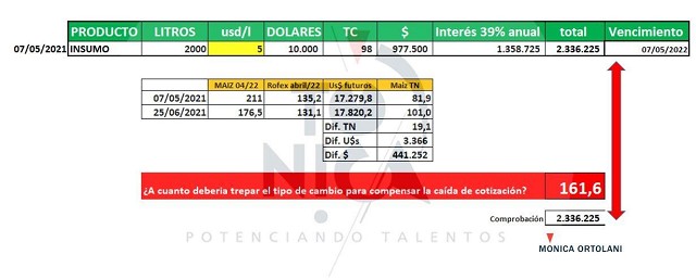 Supongamos que el 7/5/2021 pudiste cerrar insumos antes de sus aumentos, U$s 10.000, financiándote a 360 días a cosecha entregando cheques al 39% anual, por un total de $ 2.336.225 (no contemplo IVA para hacer más simples los números).