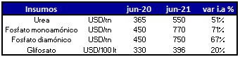 En la siguiente tabla, te mostramos la relación entre el valor de los insumos, con las cotizaciones de tu moneda de cambio, que son tus granos, en el disponible al 25/06/2020 y 2021, reflejándote los quintales necesarios para adquirirlos y su variación en porcentaje interanual.