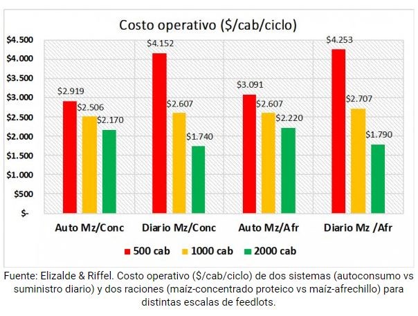 Por otra parte, los costos de los esquemas de autoconsumo son inferiores respecto al suministro diario de ambos tipos de raciones, aunque esta situación se revierte para escalas superiores a 1.000 cabezas, debido a que es necesario preparar la ración en un mixer y distribuirla en los silos con chimango, lo cual requiere más personal.