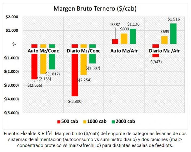 La consultora Elizalde & Riffel estimó los resultados económicos de feedlots de diferentes tamaños, con dos tipos de raciones suministradas mediante autoconsumo y en forma diaria, análisis que lleva adelante desde hace varios años en base a datos de establecimientos pampeanos que terminan animales livianos. Esta información es particularmente importante en un negocio de márgenes muy reducidos e incluso negativos, donde la escala es fundamental para diluir costos fijos y el porcentaje de maíz en la dieta, encarecido en la última campaña, también hace al resultado.