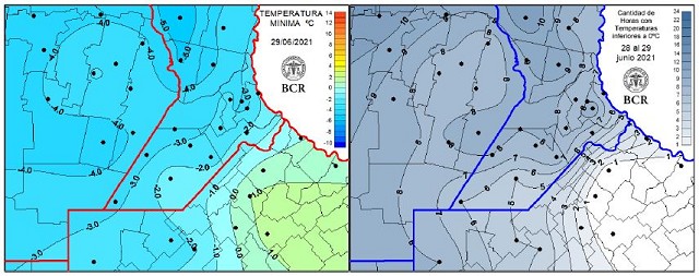 Pero se destacan los valores de Santa Fe dónde Carlos Pellegrini alcanzó los -5,6°C. Allí, los termómetros permanecieron durante más de 10 horas por debajo de cero grado. Fue el centro neurálgico de las heladas, por la baja registrada y la cantidad de horas que duró el evento. Fue una de las zonas más afectadas de la región pampeana; sólo hubo registros más severos en el oeste de La Pampa o Córdoba, o en San Luis dónde hubo valores de más de -9°C bajo cero.
