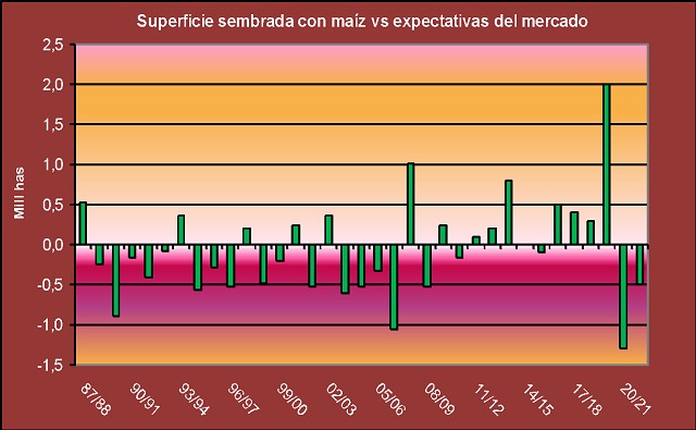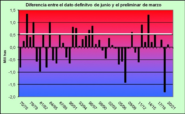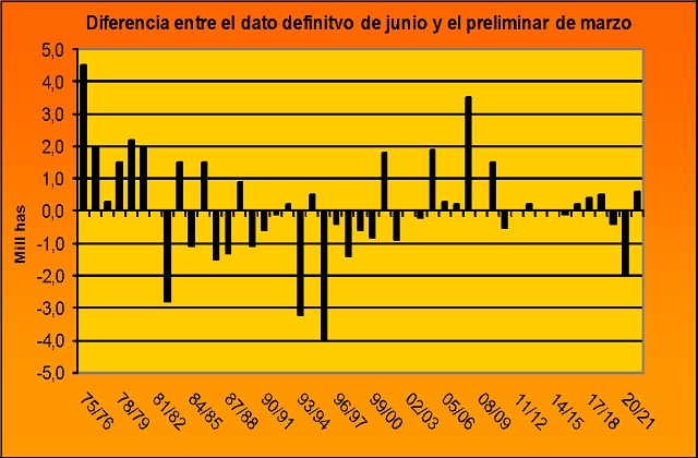 En otro orden, tal como puede apreciarse en el gráfico 2 este dato ha ido a contramano de lo observado en el pasado reciente, toda vez que en 7 de las anteriores 10 campañas el organismo ha publicado un salto en la superficie entre el reporte provisorio y el definitivo.