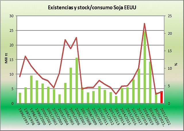 Continuando con el análisis, y manteniendo los supuestos del último reporte de oferta y demanda, la relación stock/consumo norteamericana sería de 3.5% a partir de existencias de 4.2 mill tt (ver gráfico 5). Si bien esto implica una ligera recuperación respecto al ciclo previo, el panorama luce muy tirante en la evolución histórica.