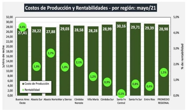 En su reporte denominado Costos Regionales de Producción de Leche, el Observatorio de la Cadena Láctea informó que el precio de la leche al productor para el mes de mayo del 2021 fue de $ 29,77/litro (SIGLeA) y $ 30,37/litro (Panel 18 Empresas).