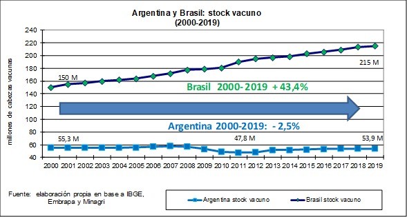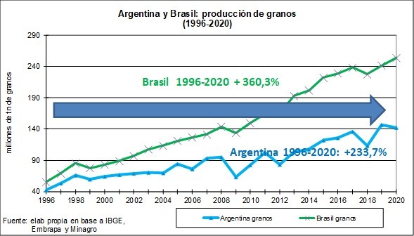 En el largo plazo, en producción agroindustrial, en el largo plazo, los vecinos ganan por goleada. El stock vacuno creció en Brasil 43% punta a punta en los últimos 20 años, y la producción de granos 360% en los últimos 25 años. En la Argentina, el stock vacuno ¡cayó 2.5%!, y la producción de granos creció 233% en iguales períodos.