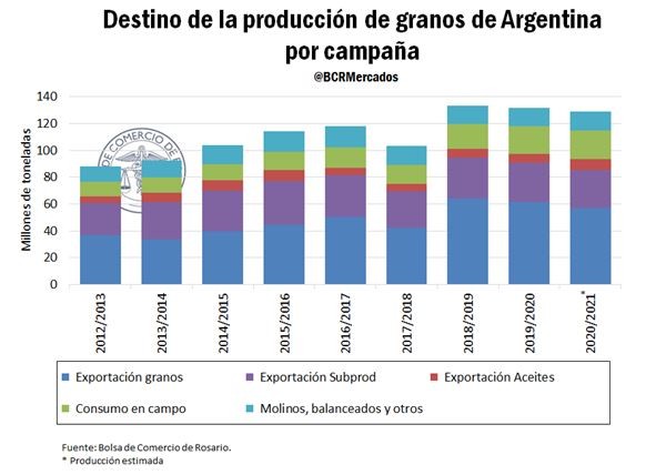 Para la campaña 20/21, se espera que se exporte un total de 93,4 Mt de granos y subproductos1 lo que equivale al 73,25 % de la producción de granos de Argentina. De este total de exportación se espera que 56,8 Mt sean granos, cereales y oleaginosas mientras que se espera que se exporten 36,6 Mt de productos industriales derivados del procesamiento de cereales y oleaginosas. Esto implica que el 39 % de la exportación de Argentina de granos tiene algún grado de procesamiento industrial. Este valor viene cayendo desde los picos registrados en 2013 principalmente debido a la mayor exportación de maíz y trigo que realiza luego de la recuperación del área en ambos granos desde dicho año.