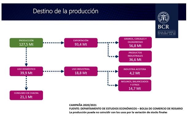 Por otro lado, se espera que 39,9 Mt de toneladas granos y subproductos se vuelquen al consumo doméstico. De este total, se estima que 21,1 Mt de granos se terminen consumiendo en campo, sin pasar por el circuito comercial. En este consumo “en campo” se estima la producción de semillas, el grano que se destina a consumo animal, balanceados y el consumo de fábricas de expeller de oleaginosas. El resto del consumo doméstico, 18,8 Mt, se estima que sean de “origen industrial”. El consumo de origen industrial se considera a la producción de granos procesados que no se termina exportando. Dentro de este grupo se encuentra el consumo interno de origen industrial que proviene de la “industria aceitera” 4,2 Mt (harina y aceite de soja que provienen de grandes fábricas por método de extracción, biodiesel, glicerina, lectina y otros subproductos) y 14,7 Mt de molinos, balanceados y otros entre los que se encuentra la producción de malta, la harina de trigo y tanto la molienda seca como la molienda húmeda como la producción de etanol a partir del maíz.