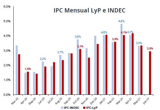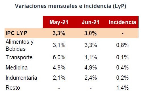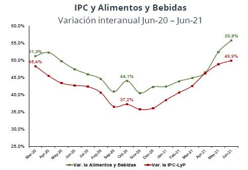 Desde septiembre del 2018 que el rubro Alimentos y Bebidas crece por encima del IPC General en términos interanuales. En 8 de los últimos 12 meses la evolución del nivel de precios del rubro Alimentos y Bebidas se incrementó por encima que el índice general. En mayo se registró una suba de alimentos menor al Índice General en términos mensuales (3,1% vs 3,3%), mientras que en junio los alimentos superaron al Índice General (3,3% vs 3,0%). Analizando el margen, la incidencia del rubro Alimentos y Bebidas sobre el índice general (3,0% mensual) fue del 0,8%.