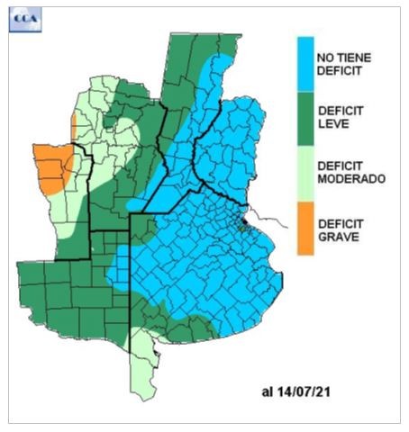El mapa de necesidades hídricas muestra un patrón con muy poca demanda. Es razonable que sobre el este la situación sea más holgada, es una característica típica del invierno. A diferencia del año pasado, la demanda recién es más importante hacia el centro de la provincia de CB o en el extremo sur de BA, el resto de áreas aptas para trigo y cebada, no tienen necesidades hídricas o si las tienen no son significativas.