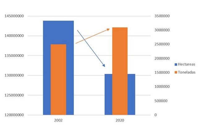mientras la superficie cayo un 10%, en las tierras de mayor productividad.