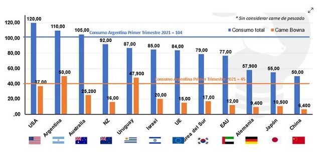 Australia. Si analizamos solo el consumo de carne vacuna somos los primeros del