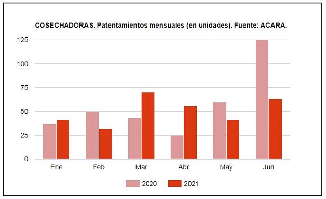 En el mercado de cosechadoras, las cifras arrojan datos dispares. Si bien en junio se reportó un fuerte crecimiento respecto a mayo, las 63 unidades patentadas durante el mes pasado implicaron una caída de -49,6% respecto a igual mes de 2020.