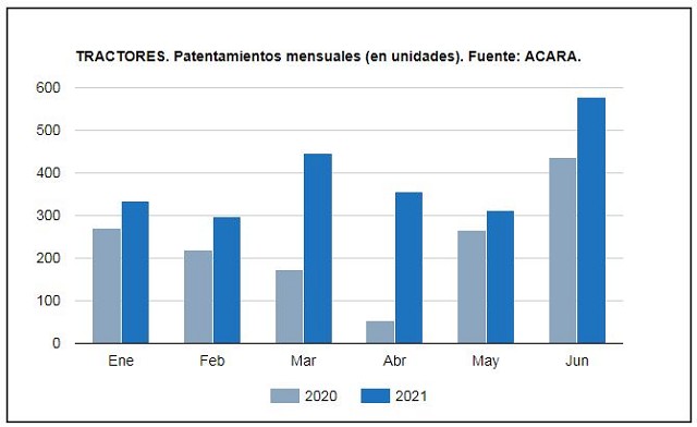Según el informe mensual de la Asociación de Concesionarios de Automotores de la República Argentina (ACARA), en junio se patentaron 577 tractores en Argentina, con un crecimiento de +84,3% respecto al mes anterior.