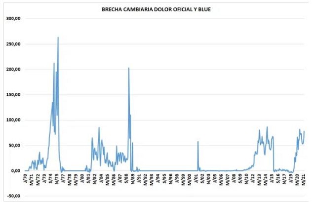 El gráfico 2 muestra la evolución de la brecha cambiaria entre el dólar oficial y el blue en los últimos 50 años y medio. Los picos más altos están en 1975 con el rodrigazo, en la hiperinflación y otros momentos de crisis cambiaria como a fines de 1983.