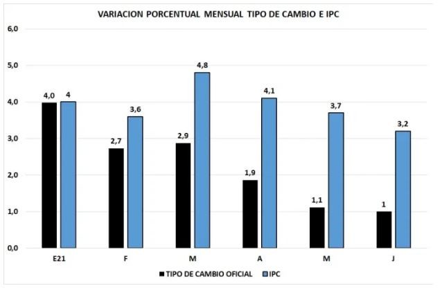 Como puede verse en el gráfico 1, a partir de febrero el BCRA viene ajustando el tipo de cambio oficial muy por debajo de la inflación. Para el cálculo de aumento del tipo de cambio oficial se toma el promedio mensual y el IPC de junio es la estimación del REM.