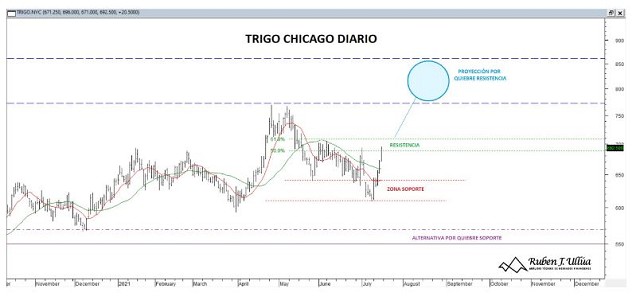 Gran respuesta alcista del cereal en las últimas jornadas ha llevado el precio desde mínimos de 609.5 centavos, hacia niveles de 696 centavos. Este avance en curso podría formar parte de la reanudación tendencial en el previo, con posibilidades de retorno hacia instancias de máximos de abril y mayo pasado en torno a los 770 centavos e incluso acceder hacia objetivos más ambiciosos en la zona de 850 centavos para adelante. Estaremos atentos entonces ante subidas por encima de 690-710 centavos ya que ello estará validando la salida tendencial alcista mayor en el precio del cereal.