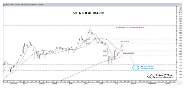 En el plano local, la baja iniciada en máximos de 380-382 dólares hacia el pasado mes de mayo, ha accedido hacia mínimos de 307 dólares y desde entonces se originó la recuperación de las últimas semanas. Este avance en curso tiene resistencia en la zona recientemente testeada de 343-353 dólares. Si bien los precios podrían aun buscar de lleno esta zona, en la medida que no sea superada, resulta posible desde estas instancias la baja quede retomada, inicialmente buscando la zona de 330-320 dólares y luego retornando hacia instancias de mínimos correctivos en los 307-295 dólares.