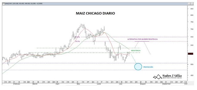 Desde lo técnico vemos que el comportamiento del cereal permanece vulnerable, principalmente debido a la cobertura de posiciones compradas por parte de especulativos institucionales. En relación a lo propuesto, creemos que en la medida que los precios no logren recuperarse por encima de la zona de 560-585 centavos, aun habrá posibilidad que desde aquí veamos nuevas debilidades, que lleven el precio hacia instancias de soportes más deprimidas en 510-470 centavos, para quizás recién allí probar un piso de la baja y habilitar recuperaciones mayores hacia los próximos meses.