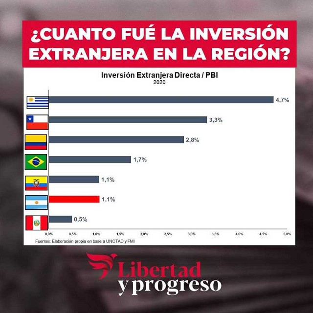 Según datos revelados por las Naciones Unidas, la Inversión Extranjera Directa en Argentina (IED) fue de aproximadamente US$4.100 millones el año pasado, lo que representa tan sólo un 1,1% del PBI, ubicándose entre los países que menor IED recibe en la región. Sólo Perú obtiene un rendimiento peor al de Argentina con una IED del 0,5% del PBI. En el otro extremo, lidera Uruguay con una proporción del 4,7% del PBI.