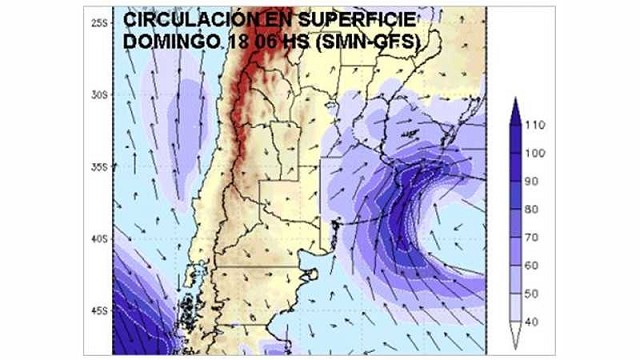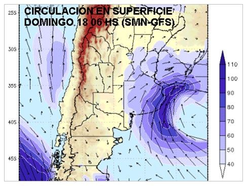 Como puede observarse, hubo intensidades de vientos superiores a los 80 km/h (colores azules más intensos). Notemos como la influencia se sintió hacia el interior, sobre la zona antes mencionada, con vientos por encima de los 40 km/h.