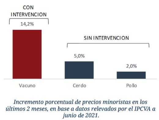 Comparado con otras carnes cuyos mercados no han sido intervenidos, la carne vacuna no solo no ha bajado sino que, incluso, ha perdido competitividad. En los últimos dos meses, el precio promedio de los 24 cortes vacunos relevados por el IPCVA pasó de valer $630,03 a $719,49, es decir sufrió un aumento del 14,2% mientras que el pechito de cerdo y el pollo, sin ningún tipo de intervención en sus mercados, aumentaron un 2% y un 5%, respectivamente.