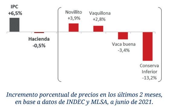 Más aún, si analizamos las variaciones de precio por categoría, vemos que justamente la hacienda que mayormente consume el mercado interno -novillitos y vaquillonas- registró incrementos promedio de entre 3% y 4%, mientras que aquello que no se consume internamente como vacas de conserva y toros, cayeron más de un 13% a valores corrientes.