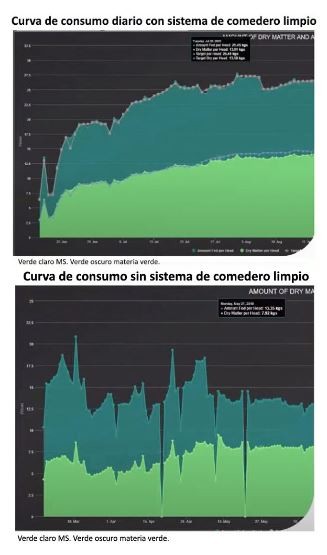 Para el especialista, es fundamental aprender a utilizar las curvas de consumo que brindan los sftwares para monitorear el comportamiento de los distintos corrales, que depende del origen, el peso de entrada, la genética, entre otros. Con ese fin, presentó las capturas de pantalla de un mismo feedlot, con y sin manejo de comedero limpio, que muestran la evolución del consumo de materia seca y verde.