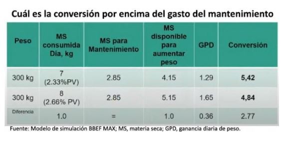 “Esto fue comprobado en varios estudios, donde se identificó que la eficiencia de conversión por encima del mantenimiento es de 3 a 1 o menos, en este caso, de 2,77. Por eso, es fundamental maximizar el consumo”, remarcó.