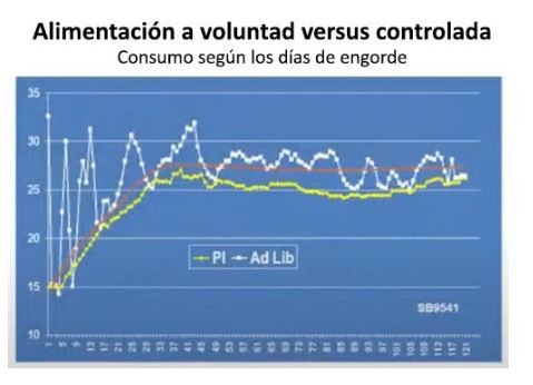 “Tras el aumento inicial, los animales que comían a voluntad tuvieron un comportamiento tipo serrucho, mientras los que recibieron alimentación controlada fueron bastante estables. Como resultado, la conversión presentó una diferencia del 12% a favor de estos últimos (a voluntad 6,9 kg y controlado 6,15). “Estos dos conceptos, estabilidad en la alimentación y consumo controlado, que dependen de la rutina diaria, tienen un alto impacto en la conversión”, subrayó.