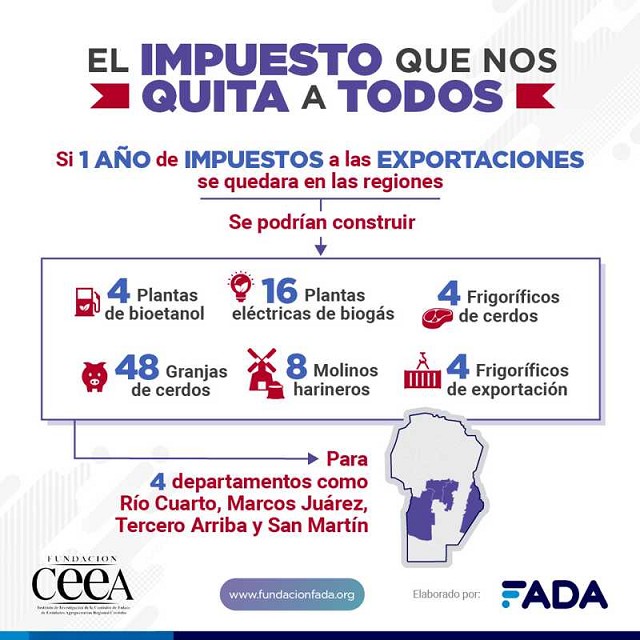 El informe demuestra lo que se va de las regiones y no vuelve. El estudio de Fundación Instituto de Investigación de la CEEA Regional Córdoba y de FADA (Fundación Agropecuaria para el Desarrollo de Argentina) muestra que con un año de impuestos a las exportaciones de una región se podrían generar inversiones que darían trabajo a 15.700 familias. Este dato medido en un caso testigo de cuatro departamentos de Córdoba, y que es aplicable a otras regiones del país, es decir que son pérdidas millonarias para muchas de nuestras ciudades y pueblos.
