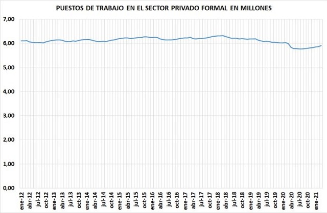 El gráfico 4, en base a datos del Ministerio de Trabajo, muestra que a principios de 2012 había 6,1 millones puestos de trabajo en el sector privado y en marzo pasado había 5,9 millones.
