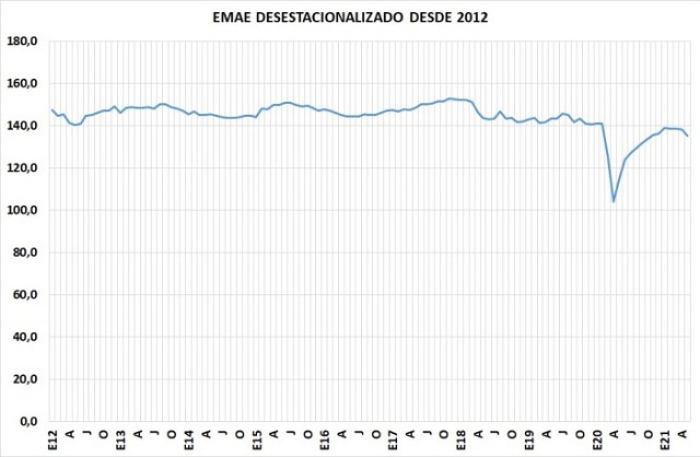 Pero por si el gráfico 1 no le convence a la vicepresidente, el gráfico 2 muestra la evolución mensual de la serie desestacionalizada del Estimador Mensual de Actividad Económica (EMAE) donde puede verse una curva plana con tendencia a la baja, resaltando la tendencia a la baja en los últimos 4 meses de este año, datos que mide el INDEC. Hay que ser demasiado negado para no aceptar que la curva es plana porque la economía está estancada hace 10 años, o mejor dicho, estancada y con tendencia decreciente desde 2018.