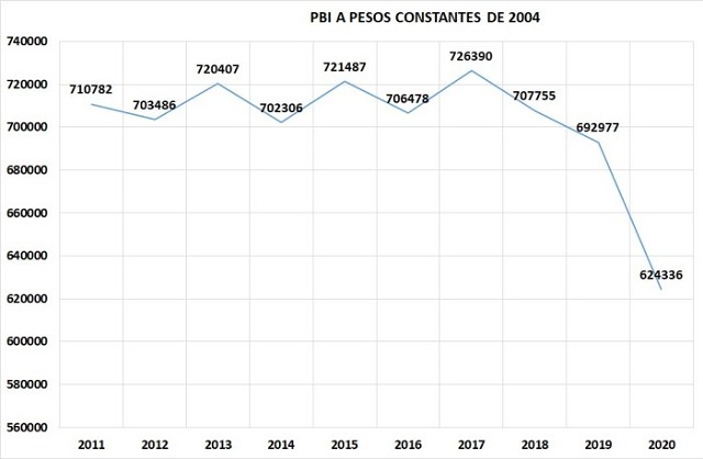 Tomando los datos oficiales a pesos constantes de 2004, el PBI pasó de $ 710.782 millones de pesos en valores de 2004 a $ 721.487 millones. Eso da un aumento del 1,5% de aumento en los 4 años, tomando punta contra punta.