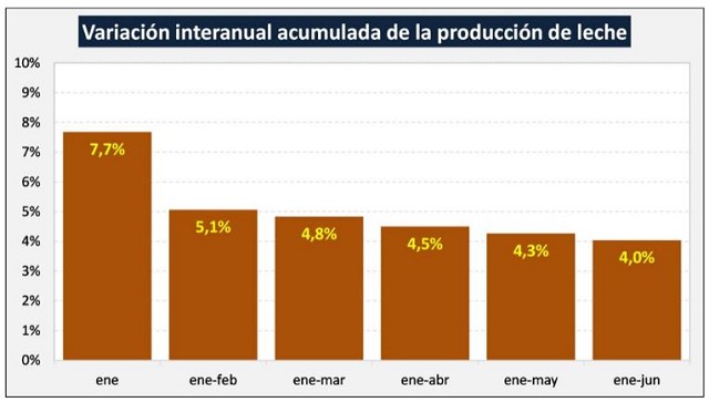 En el cuadro de abajo se puede ver la evolución de los denominados “sólidos útiles” (grasa butirosa y proteína), que crecieron el 4,4% en el acumulado enero-junio, incluso por encima del crecimiento de la producción medida en litros de leche (4,0%).