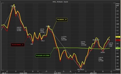 Si bien seguimos relativamente lejos de los de picos de abril del año en curso, podemos apreciar que con los cierres de la ruedas de la semana que paso; los precios del futuro diciembre se pusieron por encima del promedio de los últimos 120 días, 205 u$s/tns.