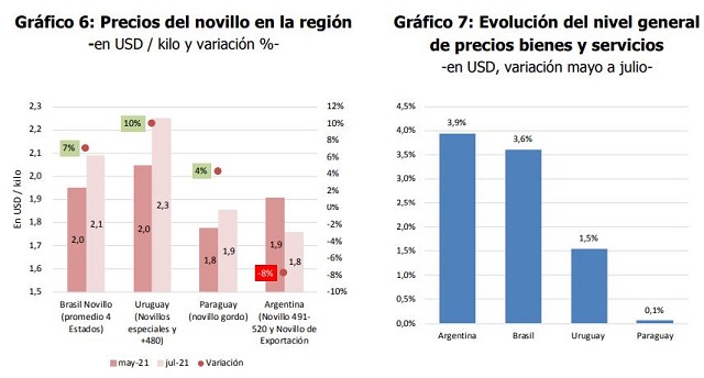 Para tener una referencia, mientras el novillo se valorizó entre un 4% y 10% en los países vecinos, en Argentina acumula un ajuste del 8% en los últimos dos meses (animal en pie, precios en dólares corrientes). El torniquete sobre los precios de la producción primaria se intensifica, se hace sentir más, en el contexto macroeconómico actual del país, en el tipo de cambio desde hace algunos meses está yendo bastante por detrás de los precios de la economía; es decir, el precio de la hacienda baja en un escenario en el que los precios de bienes y servicios están en general subiendo en dólares. Como referencia, en los últimos dos meses (de mayo a julio) el costo de vida en Argentina habría aumentado 3,9% medido en dólares (tipo de cambio oficial) por encima de lo sucedido en Brasil (3,6%), en Uruguay (1,5%) y en Paraguay (0,1%).