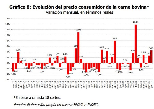 Finalmente, en lo que hace a precios consumidor, de acuerdo al relevamiento del IPCVA, en junio la carne aumentó un 8% respecto del mes previo (tomando como referencia una canasta de 18 cortes), una suba muy fuerte (del 4,5% en términos reales) y contraria seguramente a lo que esperaba el gobierno tras su intervención al mercado de exportación. Por detrás de este ajuste de precios pueden estar varios factores, uno de ellos quizás el más importante es la menor producción de carne. En los primeros 6 meses del año la producción acumula una caída del 5,5% respecto a similar período del año previo (que llega al 6,5% si se la mide en términos per cápita), lo que genera menor disponibilidad de producto tanto para la exportación como para el mercado interno. Otro factor que puede haber incidido es la intención (hay que ver si se mantiene) de recuperar márgenes por parte del canal comercial; nótese que entre mayo de 2020 y mayo de 2021 la carne aumentó en un 75% a nivel consumidor, mientras que la hacienda en un 100%. Respecto a cómo pueden seguir los precios que paga el consumidor, en principio éstos deberían empezar a estabilizarse (e incluso bajar en términos reales) considerando la baja estacional que suele tener la demanda en los meses del invierno y el re-direccionamiento de carne desde el mercado externo hacia el interno que está forzando el gobierno. De todos modos, no deben perderse de vista ni la evolución de la producción, la estabilización de los precios será más rápida si la faena se recompone (o no se resiente más), ni tampoco la de los ingresos de la economía argentina, la inyección de fondos que se espera realice el gobierno para estimular la economía previo a las elecciones, puede fortalecer la demanda interna y mantener presionados los precios. En estos días se sabrá lo sucedido con los precios en julio, mes que puede haber empezado a marcar un cambio de tendencia.