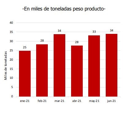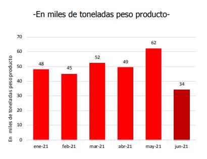 • La intervención del gobierno, primero vía suspensión de envíos, luego estableciendo un cupo a los volúmenes, castigó con fuerza el comercio exterior de la cadena. El pobre desempeño argentino contrasta con lo sucedido en países vecinos, también productores y exportadores, donde las exportaciones crecieron tanto en Brasil (+11%) como en Uruguay (+2%) en el mismo período