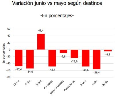 Como era de esperar el mercado destino más afectado por la medida adoptada por el gobierno argentino está siendo China, principal comprador de carne bovina congelada en los últimos años, y quien concentra mayoritariamente las operaciones que caen bajo la nueva regulación; los envíos de junio al gigante se redujeron 47,4% respecto a los del mes previo (un ajuste de 24,5 mil toneladas).