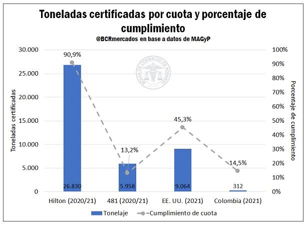 Para dar un ejemplo de esto, una de las cuotas más emblemáticas de los últimos años ha sido la Cuota Hilton. Este cupo de exportación tiene a la Unión Europea (UE) como contraparte en la negociación, bloque que dispuso las condiciones para el ingreso a dicho mercado. Los beneficios de este acuerdo radican en que ubica a las exportaciones argentinas de carne vacuna sin hueso de alta calidad en un contingente arancelario favorable y que, además, al tratarse de carne bovina de calidad elevada, su valor es superior. A nuestro país se le ha otorgado una cuota de 29.500 toneladas de carne bovina y 200 toneladas de carne de búfalo.