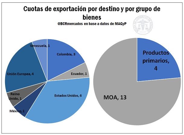 Dentro de los tipos de bienes, se destaca la elevada proporción de Manufacturas de Origen Agropecuario (MOA) y, dentro de este mismo grupo, los principales bienes con cuotas asignadas son las carnes bovinas (4) y ovina (2), mientras que luego se presentan las cuotas de lácteos (3) y quesos (1). Además, dentro de los productos primarios se destacan cuotas de ajo, azúcar, maní y tabaco.