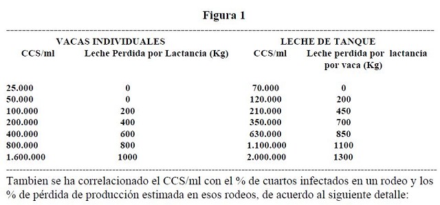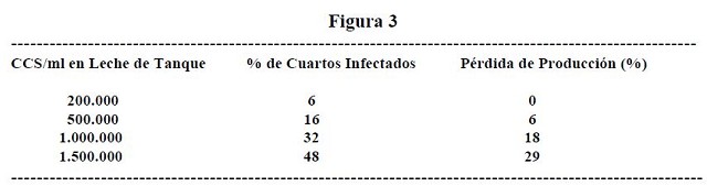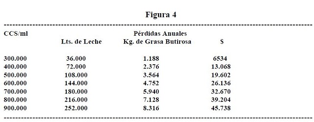 De acuerdo a estos datos de investigación generados en USA, la Asociación Argentina de Lucha contra la Mastitis (ALMAST) de Argentina, elaboró, para un establecimiento lechero medio de 200 vacas en ordeño, produciendo 4000 litros diarios con el 3.3 % de Grasa Butirosa, con un recuento de 200.000 CCS/ml y un precio de la Grasa Butirosa de 5.5 , las pérdidas anuales de leche y grasa y en pesos, si aumenta el CCS/ml hasta las 900.000/ml, de acuerdo al siguiente detalle (Chavez, 1996):