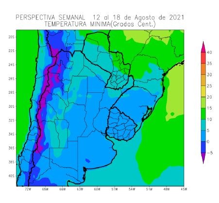 El oeste del NOA el centro de Cuyo, el oeste de Córdoba, gran parte de Buenos Aires y la mayor parte del Uruguay observarán temperaturas mínimas entre 0 y 5ªC, con heladas localizadas.