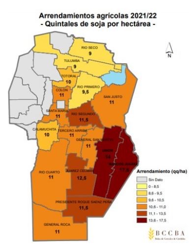 Los alquileres más elevados se estiman en el este y sureste de la provincia, encontrando los arrendamientos más caros en Marcos Juárez con un promedio de 17,5 qq/ha, seguido por Unión (14 qq/ha) y Juarez Celman (12,5 qq/ha). Por otro lado, a medida que uno se aleja hacia el norte y el suroeste de la provincia, se pueden observar alquileres más bajos, encontrando el mínimo en Río Seco (9 qq/ha), seguido por Tulumba (9 qq/ha) y Río Primero (9,5 qq/ha).