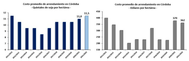 La primera estimación de arrendamientos agrícolas para la campaña 2021/22 arrojó un valor promedio de 11,5 quintales de soja por hectárea en la provincia de Córdoba, alcanzando el valor más elevado de las últimas diez campañas. Respecto a la campaña previa, el arrendamiento aumentaría un 5%, es decir 0,5 quintales por hectárea. Al medir los alquileres en dólares, se observa una caída de USD 17 por hectárea en comparación a la campaña precedente, como consecuencia del menor precio de la soja para mayo de 2022, que se espera en USD 315/tn. La estimación surge del relevamiento a los más de 200 colaboradores de la Bolsa de Cereales de Córdoba, quienes reportan los valores promedios de arrendamientos en sus zonas de influencia, así como también las modalidades de estos.