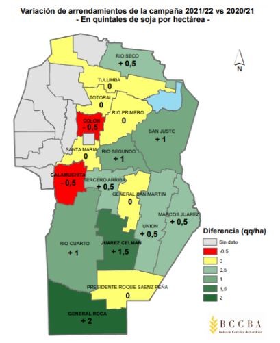 Con respecto a la campaña 2020/21, 2 de los 17 departamentos analizados presentaron una disminución en el costo de la tierra. Los departamentos que se destacan son Calamuchita y Colón, con una disminución de 0,5 quintales por hectáreas. El costo de alquiler promedio en General San Martín, Pte. Roque Saenz Peña, Río Primero, Santa María, Totoral y Tulumba se mantuvo constante respecto al año anterior, y los 9 departamentos restantes mostraron un incremento en el arrendamiento. Los casos más destacables fueron los de General Roca (+2,0 qq/ha), Juárez Celman (+1,5 qq/ha), Río Cuarto (+1 qq/ha) y Río Segundo (+1 qq/ha).